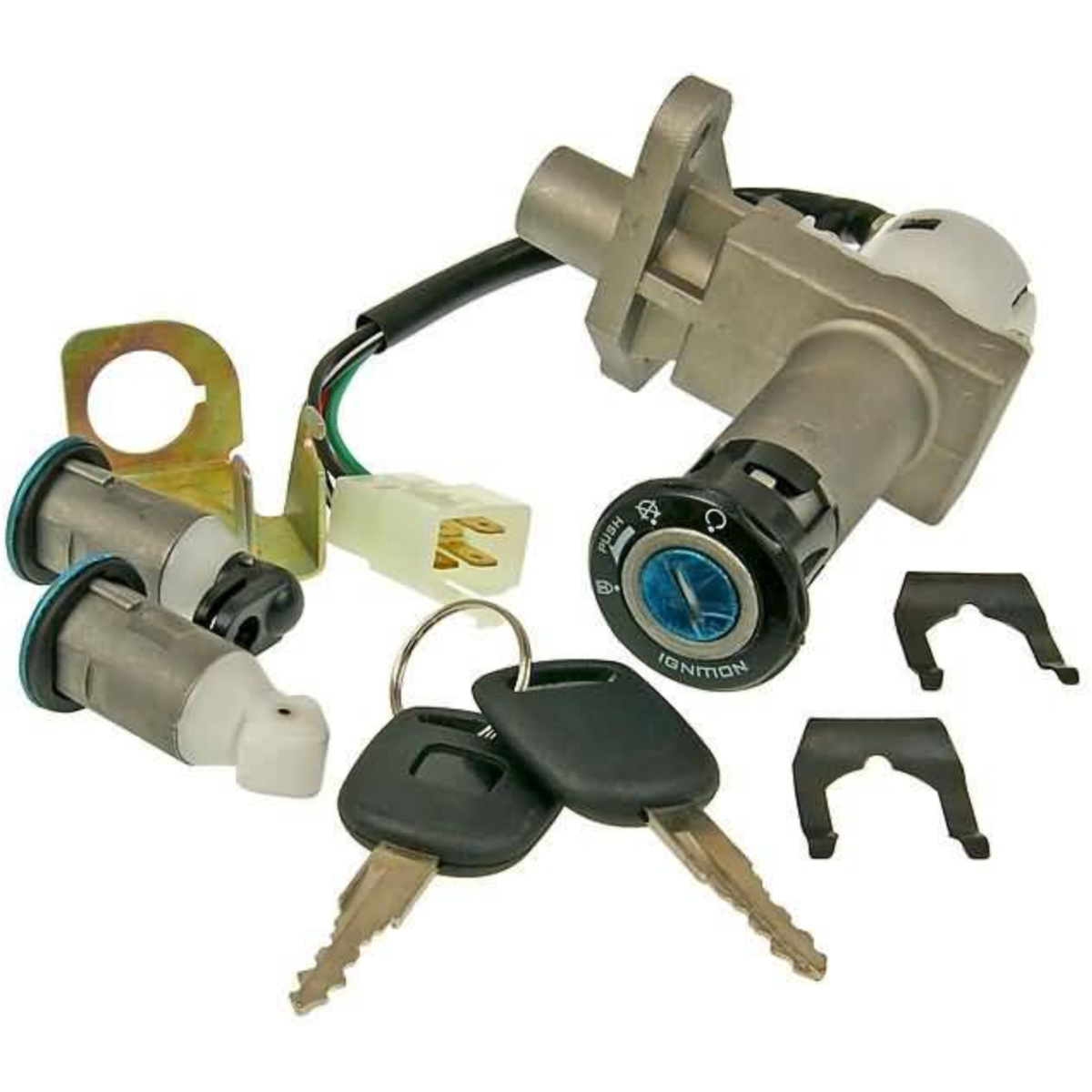 Complete lock barrel with 2 spare keys for Chinese-built 125/150cc 4-stroke scooters. There are various bodywork versions for this ignition barrel. Version 1 has a 4 pin plug on the barrel and 2 separate keys for the seat and extra compartment. Please check the image for the correct item before ordering.