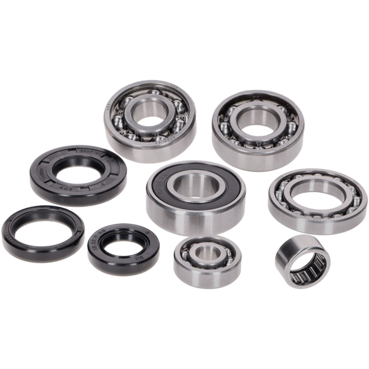 Complete set of engine bearings suitable for various Vespa small frame models with 19mm crankshaft stub and 2-stroke engine. This overhaul and maintenance bearing set is designed as a complete revision kit and comes with all bearings in the appropriate specifications and the required oil seals.