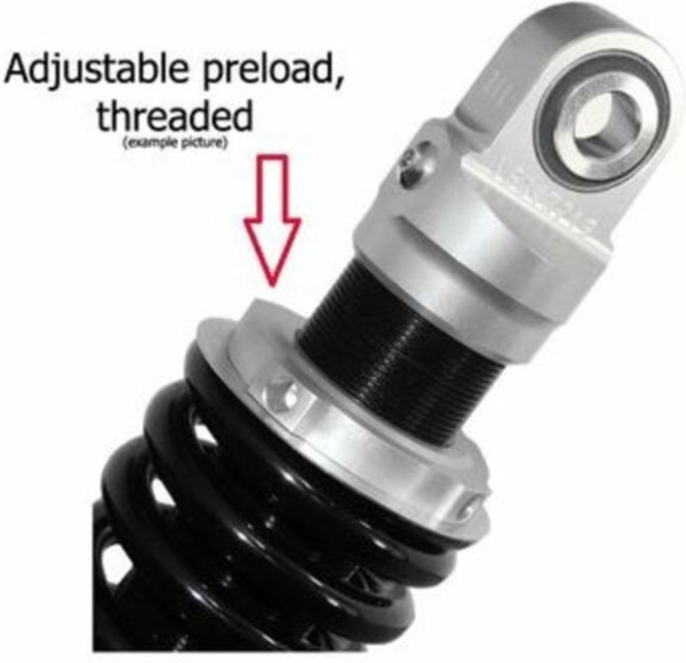 Thread Spring Preload or adjustable spring screw. By threading the cylindrical shock absorbers, user can turn the preload to fine tune the spring and tighten a provided bolt to fix the ring in its position.