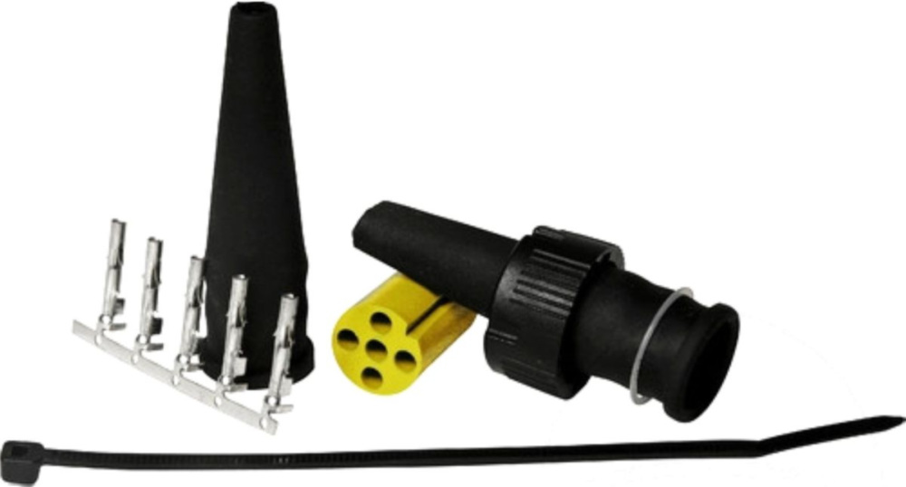 5 polige Bajonettverbinder inklusive Kontakte, 1x Tülle einfach, 1x Tülle zweifach und Montageanleitung.