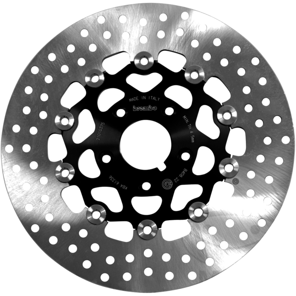 Die hochleistungsfähige Bremsscheibe von Brembo überzeugt durch hochwertige Materialien und innovative Technik. Sie besteht aus einem robusten Edelstahl-Reibring und einem leichtgewichtigen Bremstopf, der aus CNC-bearbeiteter Aluminiumlegierung gefertigt ist. Durch die Verbindung mit zehn Mitnehmerzapfen und die anschließende Eloxierung wird eine hervorragende Wärmeableitung und Langlebigkeit gewährleistet.
