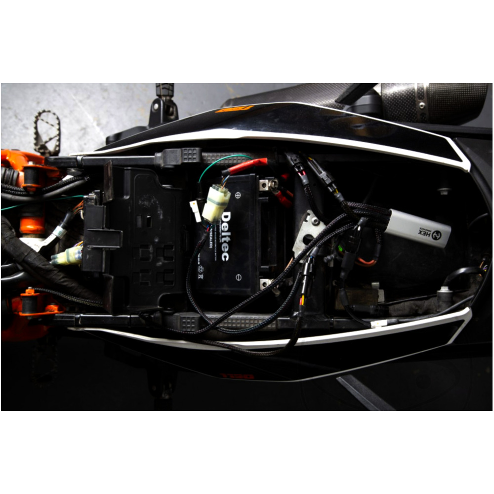 HEX ezCAN 4 Kanal CAN Bus Zubehörmanager zur frei programmierbaren Ansteuerung von nachträglich verbauten Scheinwerfer, Hupen, Bremsleuchten und anderen elektrischen Verbrauchern über die originalen Schalter eines KTM Motorrades.