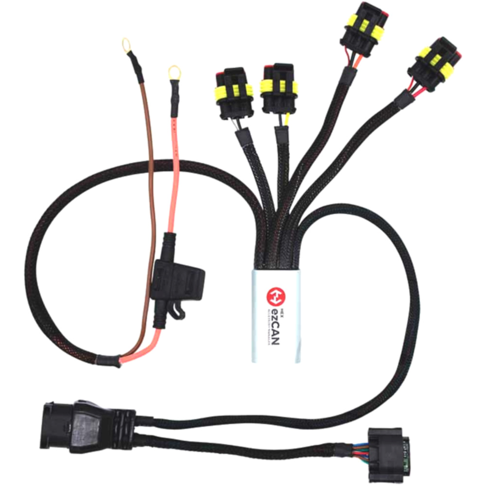 HEX ezCAN 4 Kanal CAN Bus Zubehörmanager zur frei programmierbaren Ansteuerung von nachträglich verbauten Scheinwerfer, Hupen, Bremsleuchten und anderen elektrischen Verbrauchern über die originalen Schalter eines BMW Motorrades.