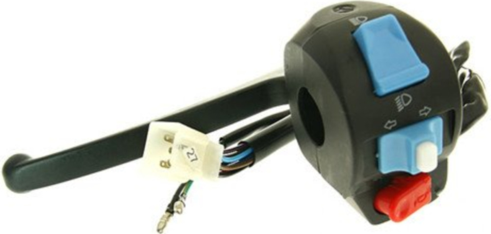 Schalterelement für Rollerlenker linke Seite. Integriert sind Auf- und Abblendlicht, Blinkerschalter und Hupe, Bremshebel hinten für Trommelbremse sowie Bremslichtschalter hinten.