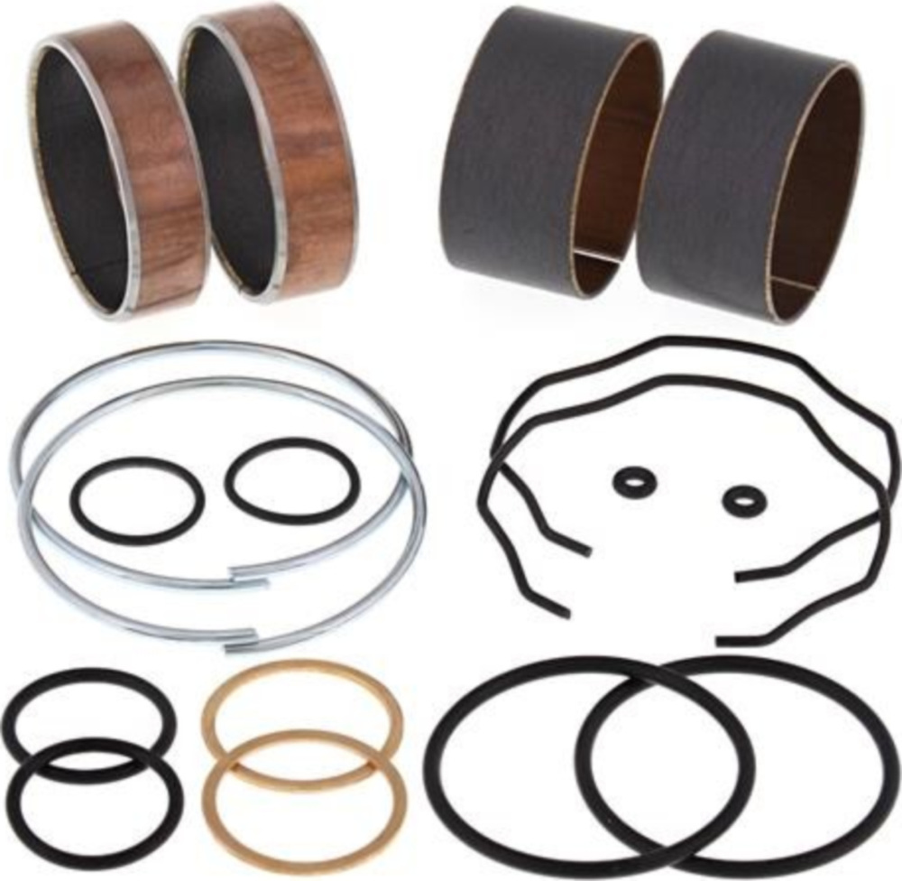 Die Kits enthalten (2) Schiebeführungen (2) Beinbuchsen zusammen mit allen notwendigen Kupferscheiben, O-Ringen und Gabeldichtsprengringen.Die Buchsen sind Prüfstand getestet bei 500.000 Schlägen mit weniger Verschleiß als bei OEM Buchsen.