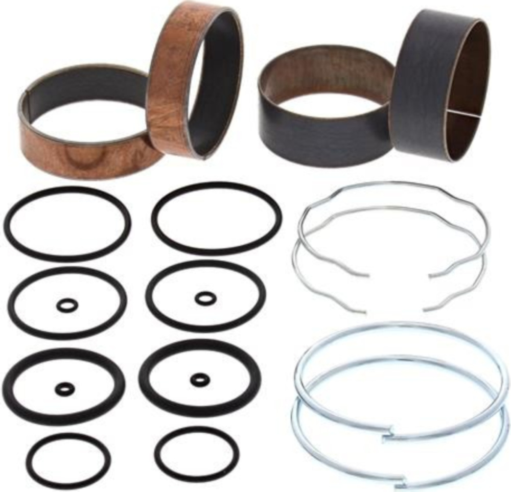 Die Kits enthalten (2) Schiebeführungen (2) Beinbuchsen zusammen mit allen notwendigen Kupferscheiben, O-Ringen und Gabeldichtsprengringen.Die Buchsen sind Prüfstand getestet bei 500.000 Schlägen mit weniger Verschleiß als bei OEM Buchsen.