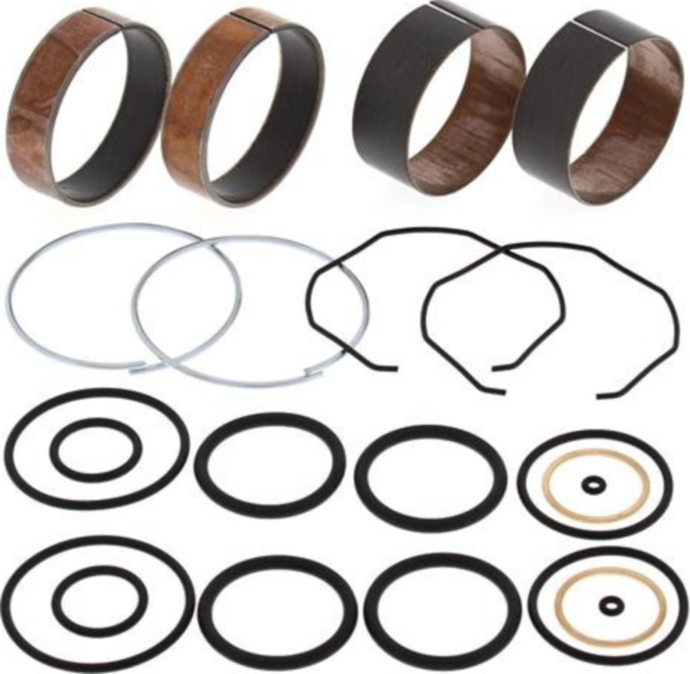 Die Kits enthalten (2) Schiebeführungen (2) Beinbuchsen zusammen mit allen notwendigen Kupferscheiben, O-Ringen und Gabeldichtsprengringen.Die Buchsen sind Prüfstand getestet bei 500.000 Schlägen mit weniger Verschleiß als bei OEM Buchsen.