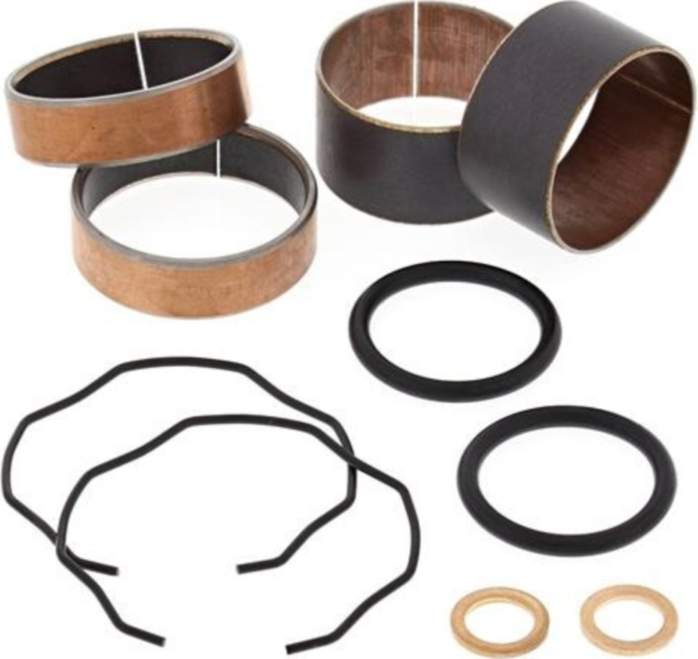 Die Kits enthalten (2) Schiebeführungen (2) Beinbuchsen zusammen mit allen notwendigen Kupferscheiben, O-Ringen und Gabeldichtsprengringen.Die Buchsen sind Prüfstand getestet bei 500.000 Schlägen mit weniger Verschleiß als bei OEM Buchsen.