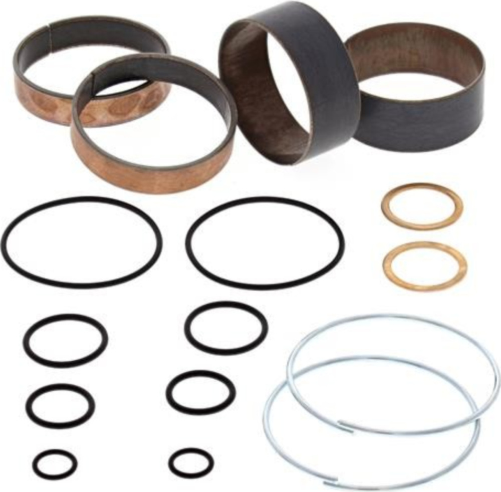 Die Kits enthalten (2) Schiebeführungen (2) Beinbuchsen zusammen mit allen notwendigen Kupferscheiben, O-Ringen und Gabeldichtsprengringen.Die Buchsen sind Prüfstand getestet bei 500.000 Schlägen mit weniger Verschleiß als bei OEM Buchsen.