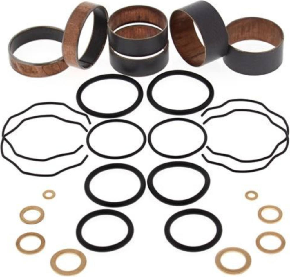Die Kits enthalten (2) Schiebeführungen (2) Beinbuchsen zusammen mit allen notwendigen Kupferscheiben, O-Ringen und Gabeldichtsprengringen.Die Buchsen sind Prüfstand getestet bei 500.000 Schlägen mit weniger Verschleiß als bei OEM Buchsen.