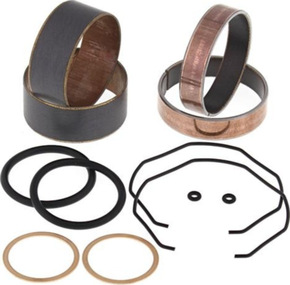 Die Kits enthalten (2) Schiebeführungen (2) Beinbuchsen zusammen mit allen notwendigen Kupferscheiben, O-Ringen und Gabeldichtsprengringen.Die Buchsen sind Prüfstand getestet bei 500.000 Schlägen mit weniger Verschleiß als bei OEM Buchsen.