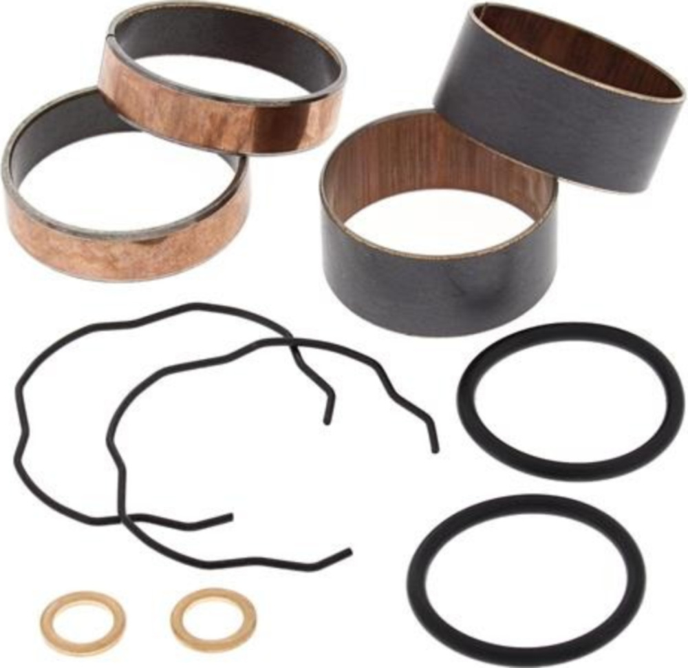 Die Kits enthalten (2) Schiebeführungen (2) Beinbuchsen zusammen mit allen notwendigen Kupferscheiben, O-Ringen und Gabeldichtsprengringen.Die Buchsen sind Prüfstand getestet bei 500.000 Schlägen mit weniger Verschleiß als bei OEM Buchsen.