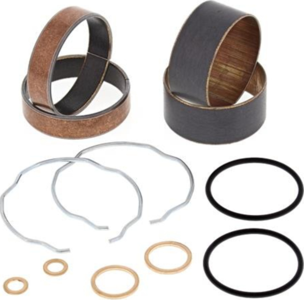 Die Kits enthalten (2) Schiebeführungen (2) Beinbuchsen zusammen mit allen notwendigen Kupferscheiben, O-Ringen und Gabeldichtsprengringen.Die Buchsen sind Prüfstand getestet bei 500.000 Schlägen mit weniger Verschleiß als bei OEM Buchsen.