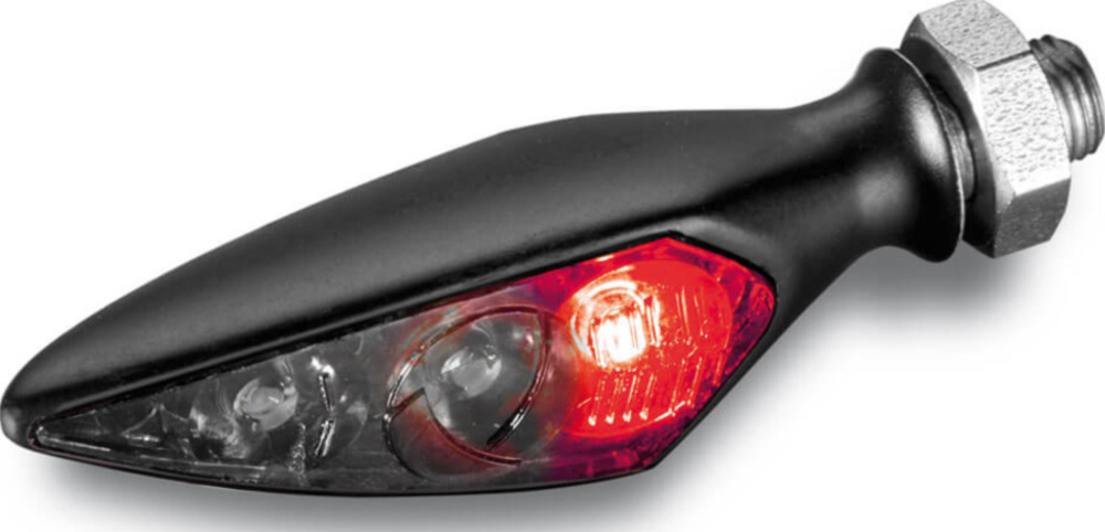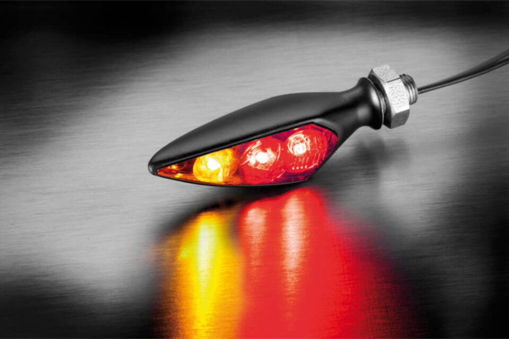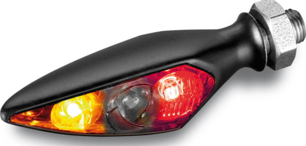 Das kompakte Gehäuse des Rhombus S DF Dark beherbergt sowohl den Blinker, als auch Brems- und Rücklicht und bietet somit eine optimale Möglichkeit der Gewichtsreduzierung am Motorrad. Geeignet für alle Motorradtypen.(1)
