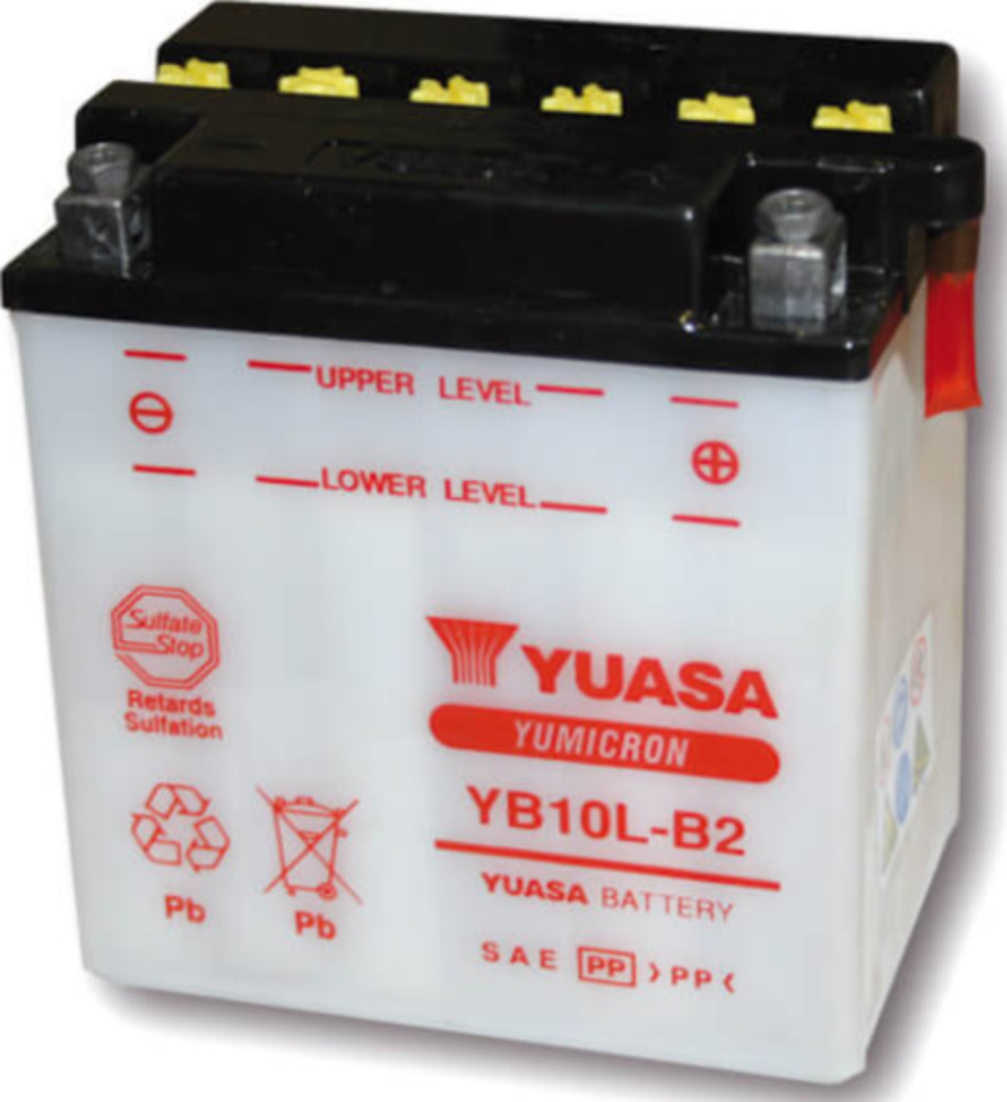 YUASA Batterie YB 10L-B2, ohne Säurepack. 12 Volt, 11 Ah. Säurevolumen 0,8 Liter, Kaltstartstrom 120 Ampére bei Minus 18 Grad.