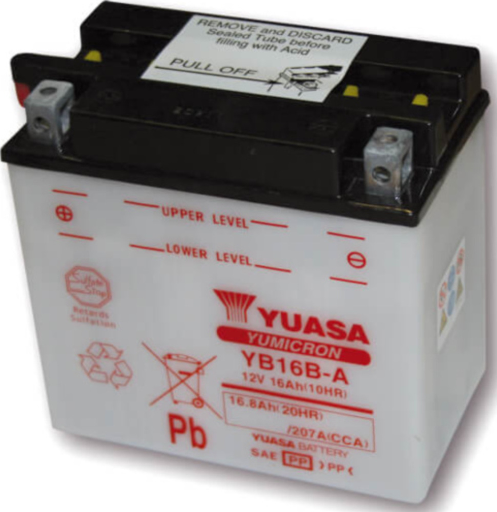 YUASA Batterie YB 16B-A ohne Säurepack 12 Volt 16 Ah Batterie das Säurevolumen beträgt 1 Liter. Kaltstartstrom 207 Ampére bei Minus 18 Grad.
