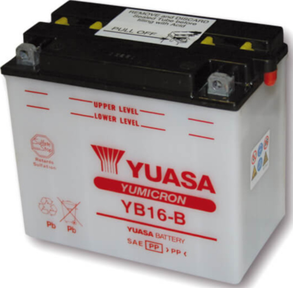 YUASA Batterie YB 16-B ohne Säurepack. 12 Volt, 19 Ah. Säurevolumen 1,2 Liter, Kaltstartstrom 240 Ampére bei Minus 18 Grad.