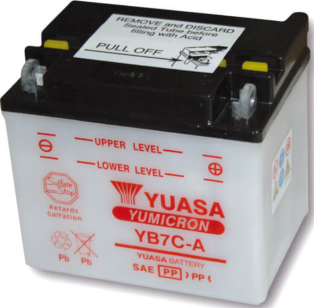 YUASA Batterie YB 7C-A ohne Säurepack. 12 Volt, 8 Ah. Säurevolumen 0,6 Liter, Kaltstartstrom 124 Ampére bei Minus 18 Grad.