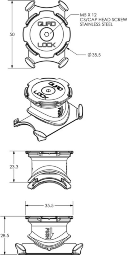 Mit einer Höhe von nur 23 mm und einer Breite von 35 mm passt die Quad Lock® Fahrradhalterung nahtlos an den Vorbau oder Lenker Ihres Fahrrads.