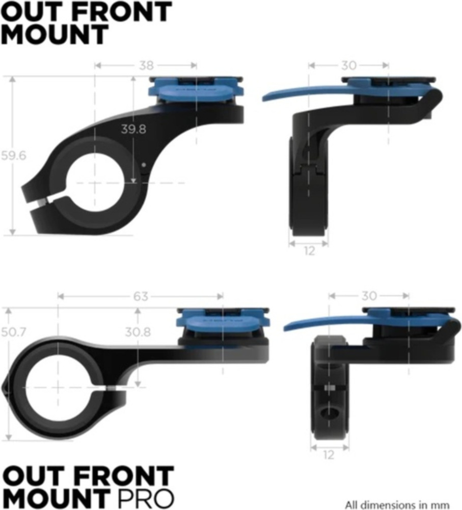 Beide Halterungen sind auf Aerodynamik ausgelegt. Die Out Front Mount PRO zeichnet sich durch ein niedrigeres Profil und einen supersteifen Befestigungsarm aus eloxiertem Aluminium aus. Die Standard-Outfront-Halterung kann umgedreht werden, um sie über den Vorbau Ihres Fahrradlenkers zu schieben.