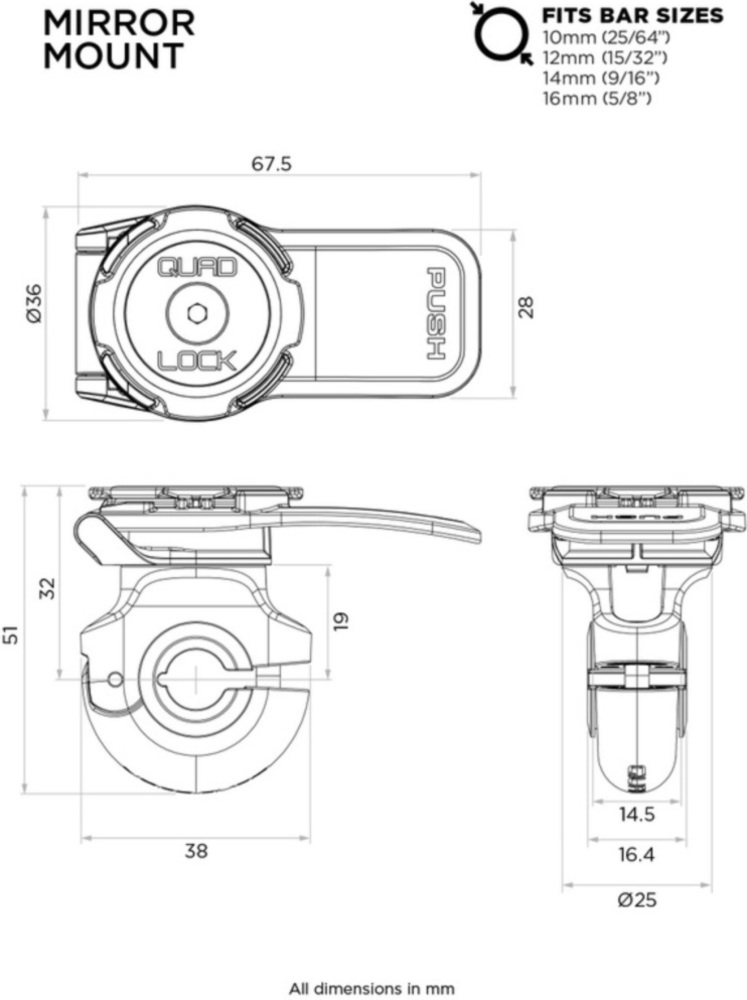 - 1 x Quad Lock® Spiegelhalterung - passend für Lenker 16mm (5/8")