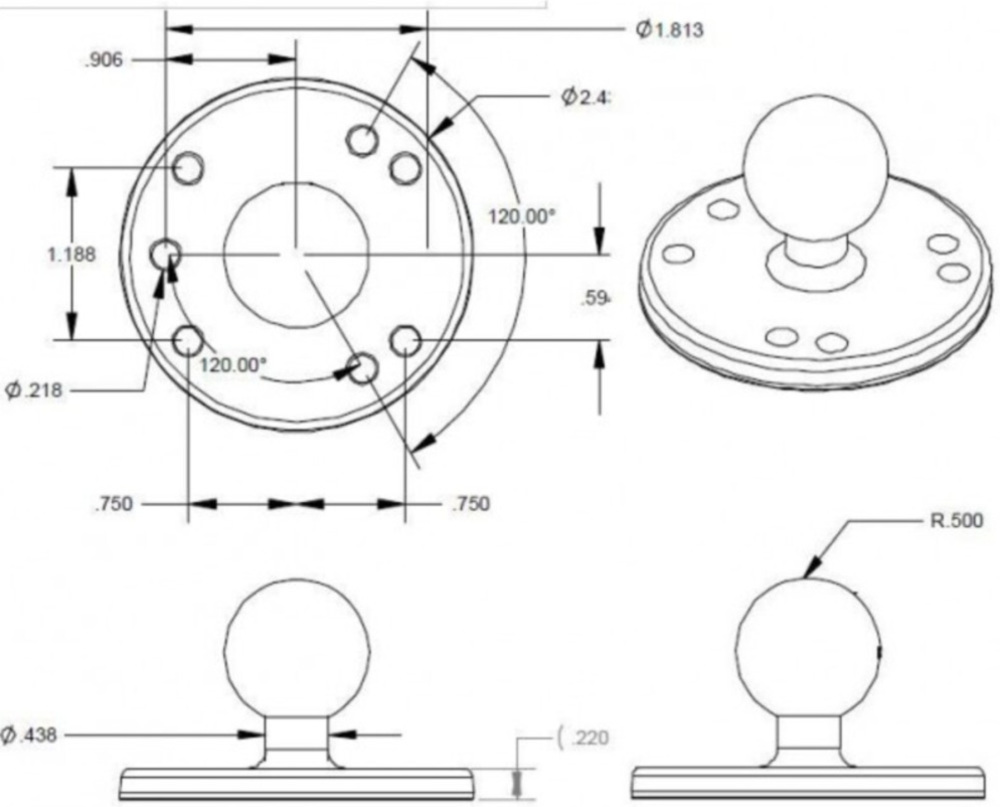 The RAM-B-202U consists of a B size rubber ball connected to a 64mm diameter round plate. This mounting component includes pre-drilled holes using the universal AMPS hole pattern.
