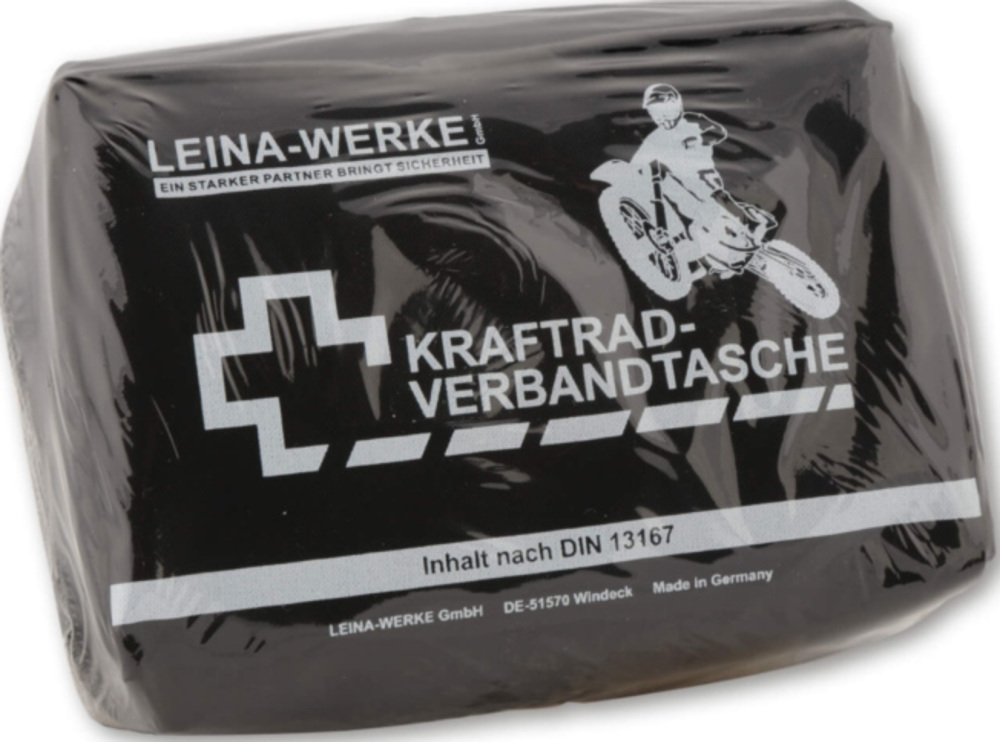 Speziell für Zweiräder zusammengestellte Erste-Hilfe-Verbandtasche. Beinhaltet nach DIN 13167 Utensilien für eine optimale Erstversorgung im Notfall. In Ländern wie Österreich, Italien, Spanien und Portugal gesetzlich vorgeschrieben. Klein, handlich, gut zu verstauen und hygienisch verpackt. Durch die Wasserabweisende Nylontasche ist der Inhalt vor Staub und Wasser geschützt. Die Utensilien sind zusätzlich in einer Folientasche eingepackt. Die beiliegende Erste-Hilfe-Broschüre in sieben Sprachen (D,GB,F,E,I,TRK,PL) informiert Sie schnell über lebensrettende Sofortmaßnahmen im Falle eines Falles. Die Tasche ist von aussen mit einem Haltbarkeitsdatum versehen.