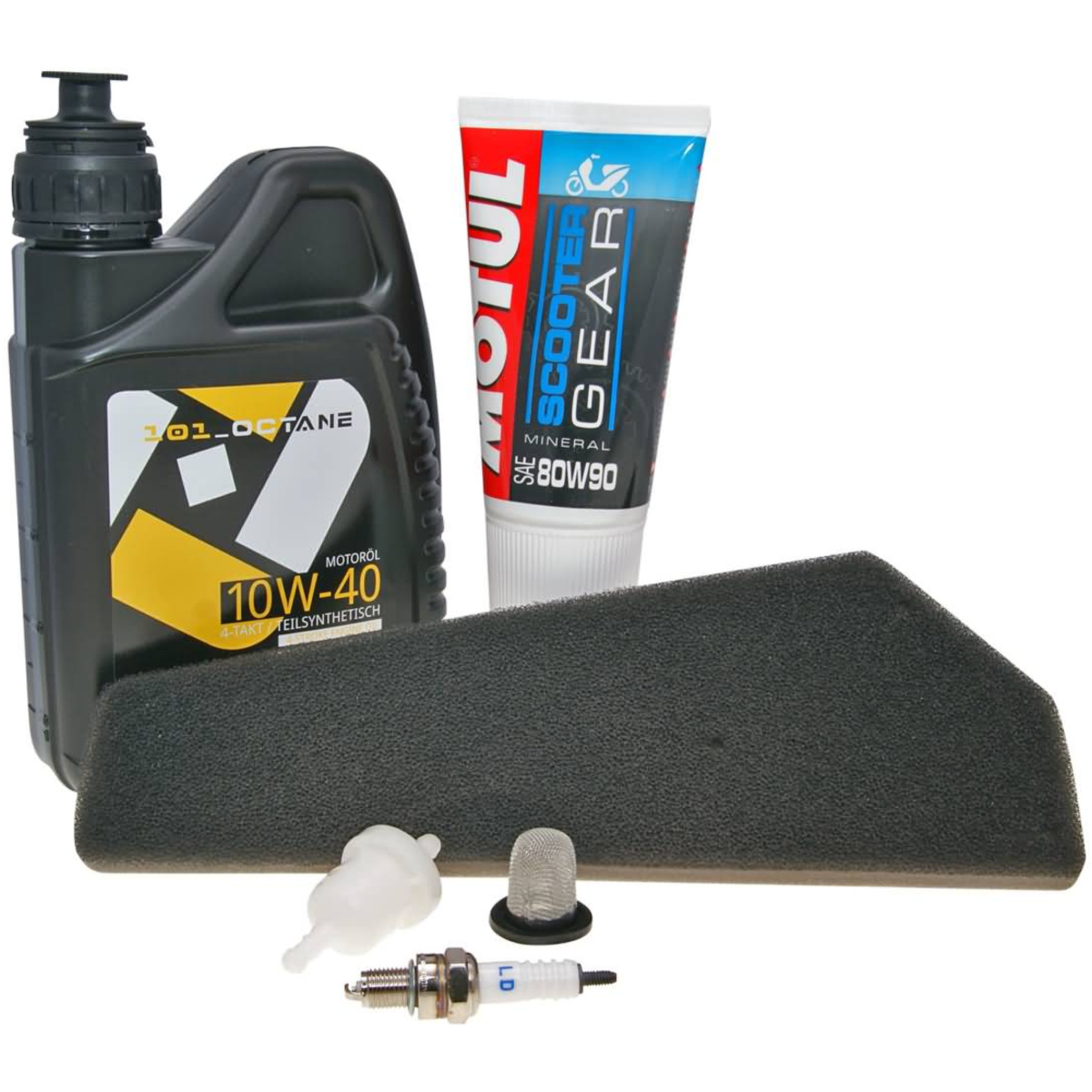 Unsere Inspektions- & Wartungssets bestehen aus: Halbsynthetisches Motoröl 10W-40, 150 ml Getriebeöl Motul, Zündkerze, Ölsieb, Benzinfilter, Luftfiltereinsatz.