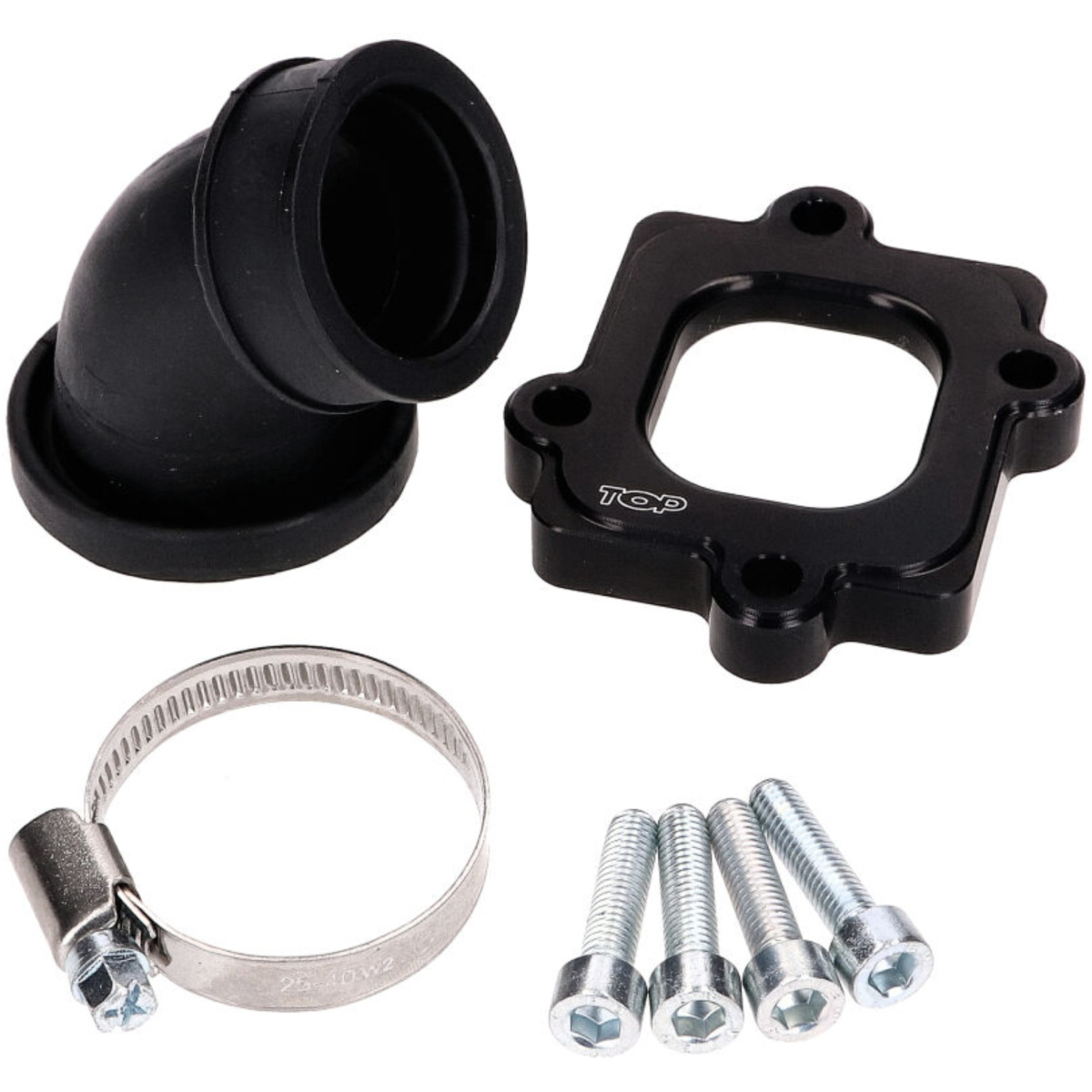 Top Performances Racing Ansaugstutzen für Vergaser mit 30mm Anschlussweite. Der Gummi-Stutzen ist um 360° drehbar und ist damit für etliche Einbausituationen geeignet. So lässt sich der Vergaser perfekt auch auf einen liegenden Minarelli Motor verbauen. Der Stutzen selbst ist um 55° geneigt.
