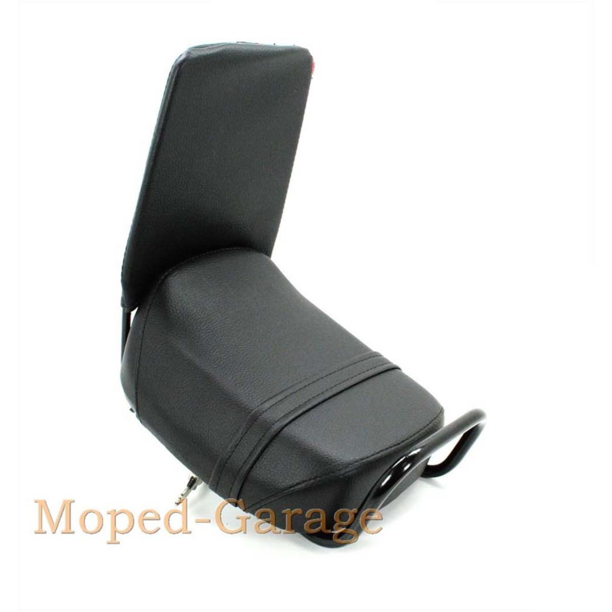 Universal Sozius Sitzbank, abnehmbare Rückenlehne, Haltegriff, passend für Zündapp, Kreidler, Hercules, Puch, Simson, DKW. Befestigung mit Klemmen am Gepäckträger. Maße: B 240mm, L 270mm, H 75mm, Klemmenabstand 90-150mm, Rückenlehnenhöhe 200mm.