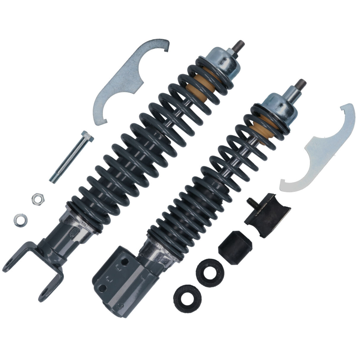 Carbone Sport RS Stoßdämpfer im Set bestehend aus einem vorderen und einem hinteren Stoßdämpfer. Die Feder-Vorspannung ist einstellbar. Passend für verschiedene Vespa Largeframe Modelle.