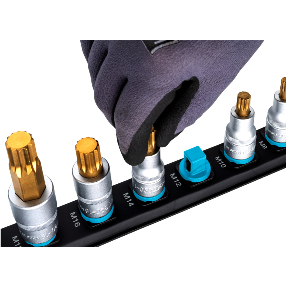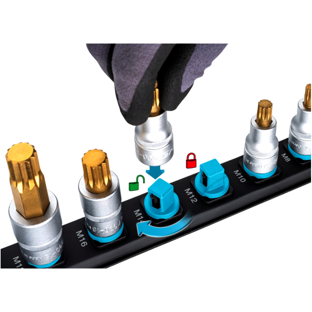 SmartRailFlexible Kunststoff-Steckleiste mit 1/2? VierkantaufnahmenMagnetische Unterseite gewährleistet Halt auf allen eisenhaltigen Flächen, z.B. an Werkstattwagen, Werkzeugwänden, Maschinen, Hebebühnen und in MetallschubladenLeicht zu reinigenLanglebige, robuste Drehverriegelung für festen Sitz und sofortigen ZugriffSicherer fixiert im arretierten Zustand: zur Entnahme Steckschlüsseleinsatz nach links drehenRobuster Metallöse zum Aufhängen, z.B. an einem HakenAntrieb: Vierkant 12,5 mm (1/2 Zoll)