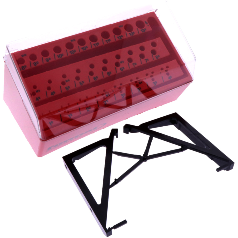 Dank des praktischen Schiebeschlitzes können Sie die Bohrergröße schnell identifizieren, auch wenn diese auf dem Bohrer nicht mehr erkennbar ist. Die Kassette ist passend für Spiralbohrer von 1-13 mm und bietet Platz für: