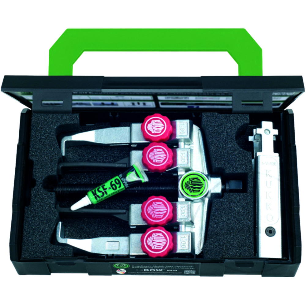 KUKKO 2-Arm AbzieherBausatz 4in1Variable Kombinationsmöglichkeit von Standard- und S-T-Haken und VerlängerungenErmöglicht platzsparendes ArbeitenIn jeder Position der Anwendung ermöglicht diese Modellausführung, auch unter Vollbelastung, parallele AbzughakenDas abzuziehende Teil liegt ausschließlich auf den Auflageflächen der Abzughaken und wird dadurch schonend abgezogenTraverse besitzt ein Sechskantprofil - dort kann ein Schlüssel zum Gegenhalten angesetzt werdenDie Spindelköpfe sind mit einem Bund versehen, der verhindert, dass der Schraubenschlüssel (dieser liegt dem Satz bei) beim Abziehvorgang abrutschtQuick Adjust Technologie - unproblematischer und schneller UmbauArmLock Technologie - Die Kreuzhaken garantieren maximale Stabilität der Aufhängung der Abzughaken im Gleitstück