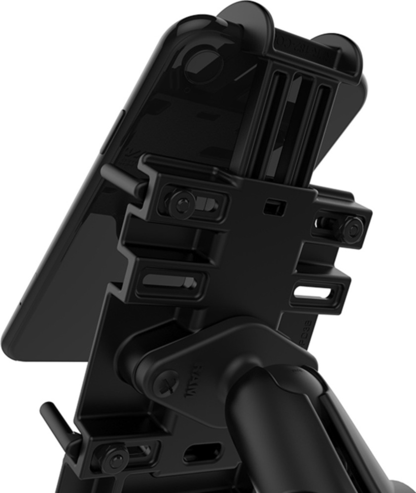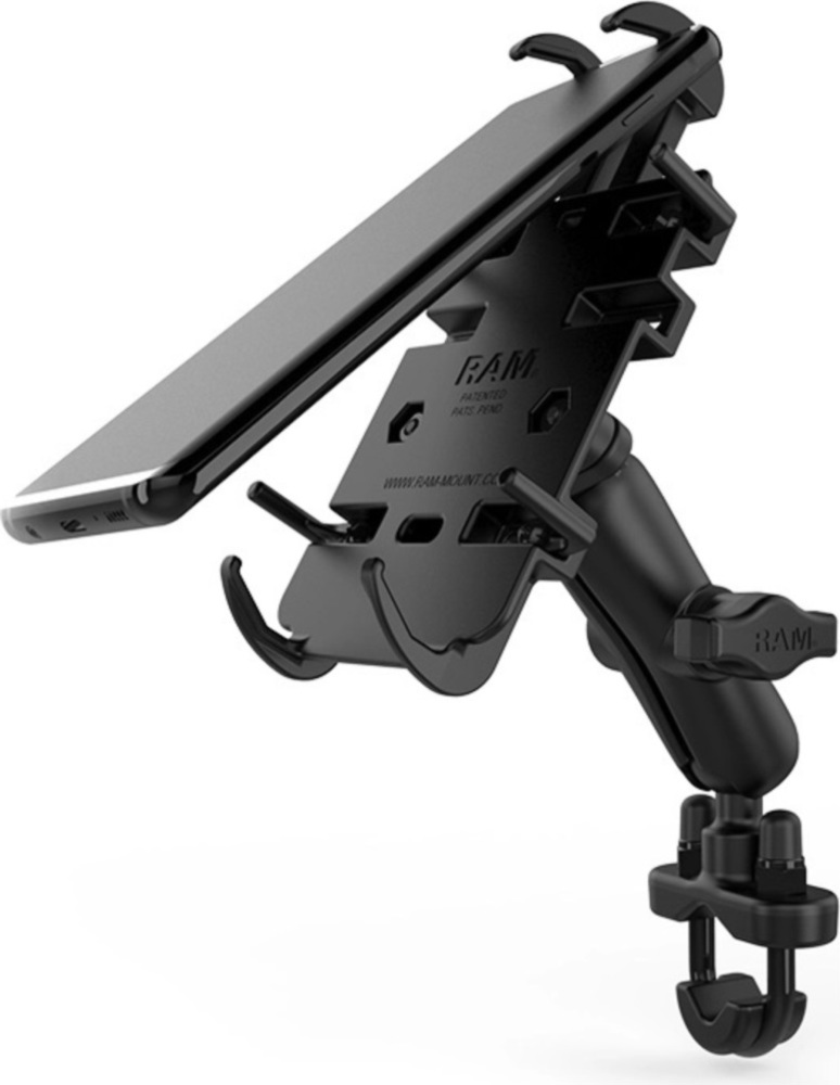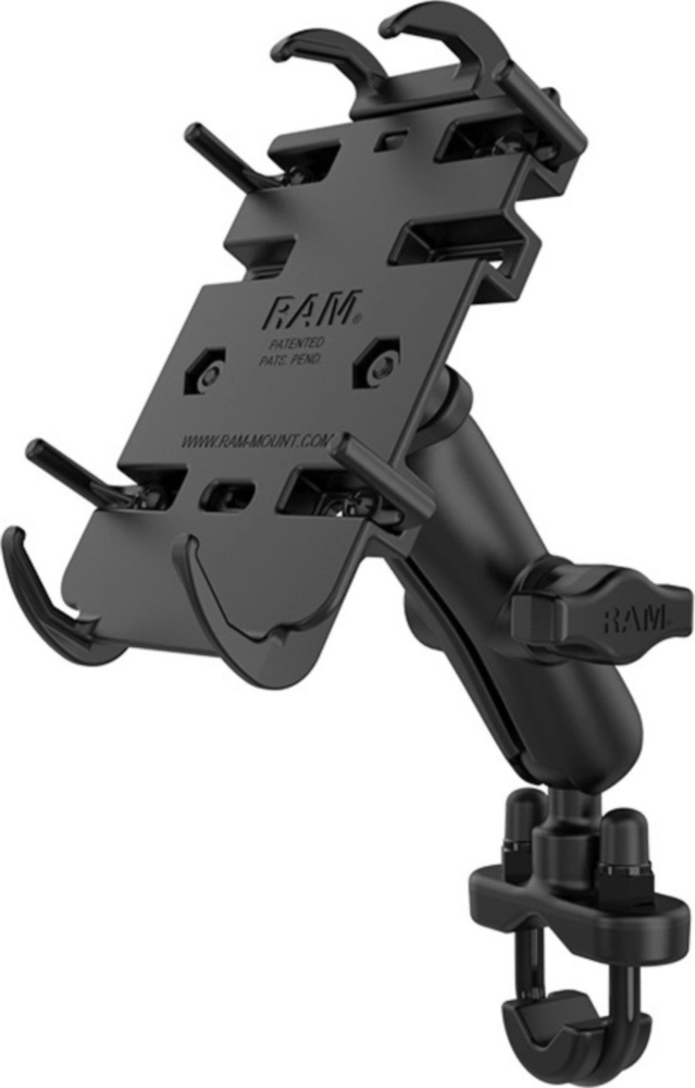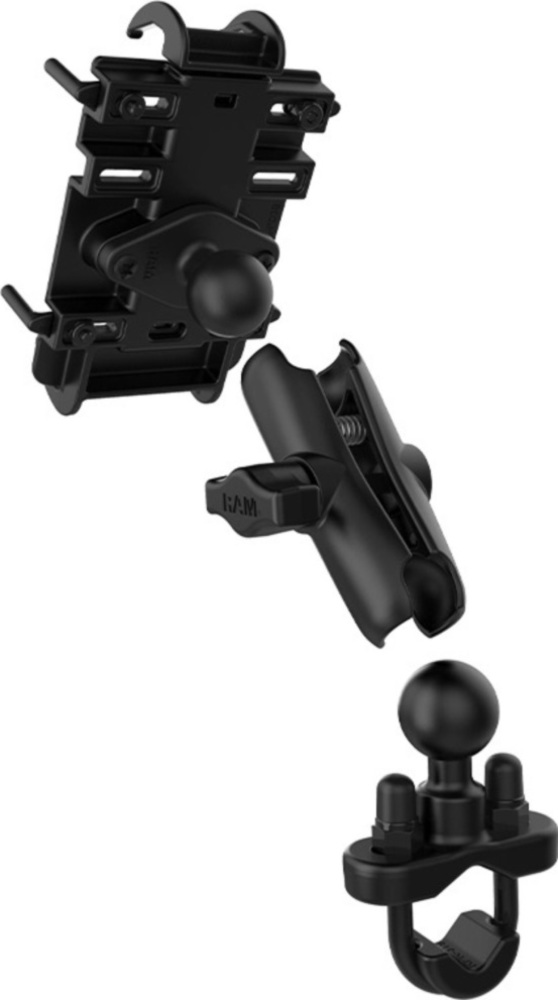 The RAM Quick-Grip™ Handlebar Mount consists of a zinc coated u-bolt base, double socket arm and spring loaded cradle for supporting most phones. Included in this package is hardware that will accommodate rails from 0.50" to 1.25" in diameter. The base includes black cover caps to be placed over the exposed ends of the u-bolt. The included composite rail adapter can narrow the rail to a minimum width of 0.5". The mount is designed with a RAM 1" diameter patented rubber ball and socket system that has adjustment points at both ends of the double socket arm; this allowing for almost infinite adjustment and perfect viewing angles.