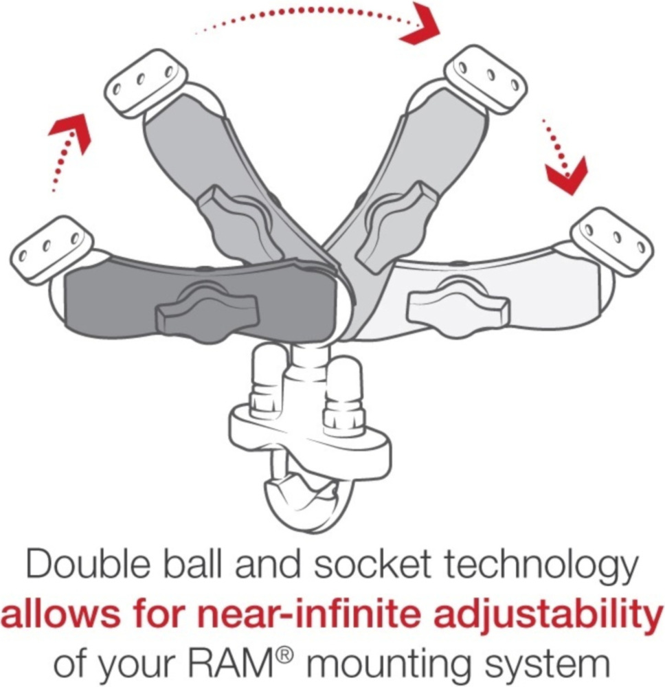 - Includes U-bolt base that accommodates rails from .5" to 1.25" in diameter and a medium length, B size RAM® double socket arm; ball and socket technology allows for near-infinite adjustability