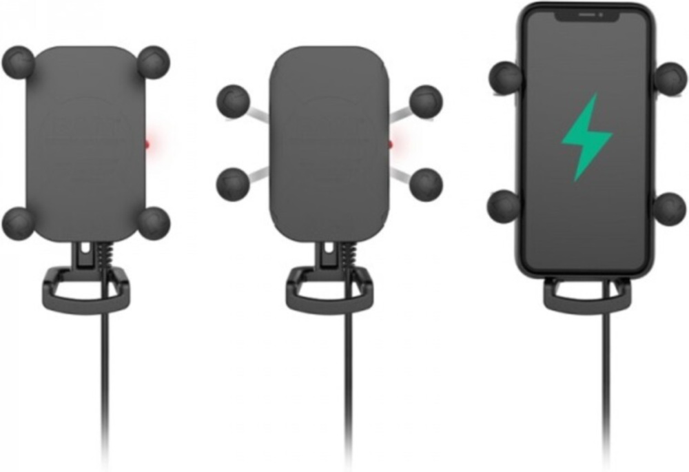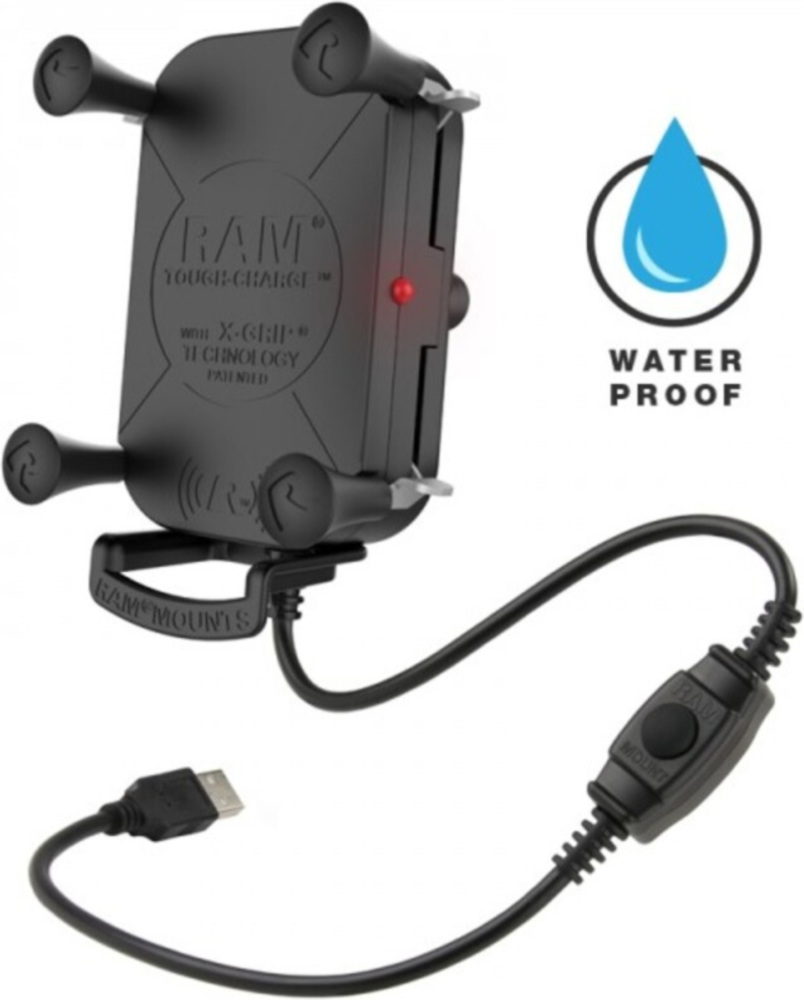 The RAM Tough-Charge™ with X-Grip® Technology is the world's first patented, universal waterproof wireless charging cradle for phones. Designed with spring-loaded RAM X-Grip® Technology, this cradle features an 'X' design that expands and contracts to secure nearly any phone while taking advantage of Qi compatible wireless phone charging. All four arms feature rubber-coated caps that hold your phone firmly in place, and the open design keeps buttons and switches accessible on the sides of phones. To insert your device, simply squeeze the arms on one side of the cradle and place your phone inside before releasing the arms. This Qi compatible wireless charging cradle ensures your compatible phone charges no matter what position it’s placed at. For added security and peace of mind, a device tether is included that’s recommended for outdoor applications. In addition, a support leg can be adjusted to the ideal position or removed altogether. This RAM Tough-Charge™ with X-Grip® Technology wireless charging kit for vehicles includes a B size diamond base featuring a 1” rubber ball – perfect for attaching to your choice of B size RAM double socket arm. The connected Type-A male pigtail connector features an in-line switch that allows you to turn off the wireless charging module when not in use. For in-vehicle charging, attach the pigtail to the included 1.2m Type-A male to Type-A female extension cable.