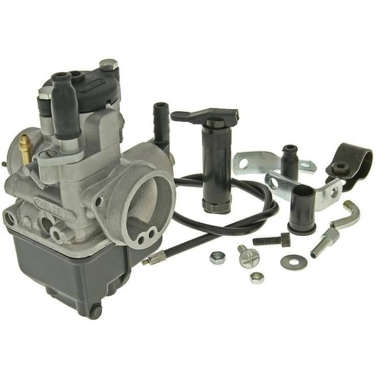 Malossi Racing carburettor set for 125-180cc Piaggio Hexagon 2-stroke scooter engines. Set comprises: 25mm Dellorto carb, cable, mounting parts and a manual choke lever. Fine adjustability and great performance in any conditions. Notably better drive in the mid-range. 30mm connection, main jet: M6 #82, pilot jet: M5 #45, air filter connection: 38mm. For separate oil mixture and great for everyday use. Ideal carb for 172 Racing cylinder kits.