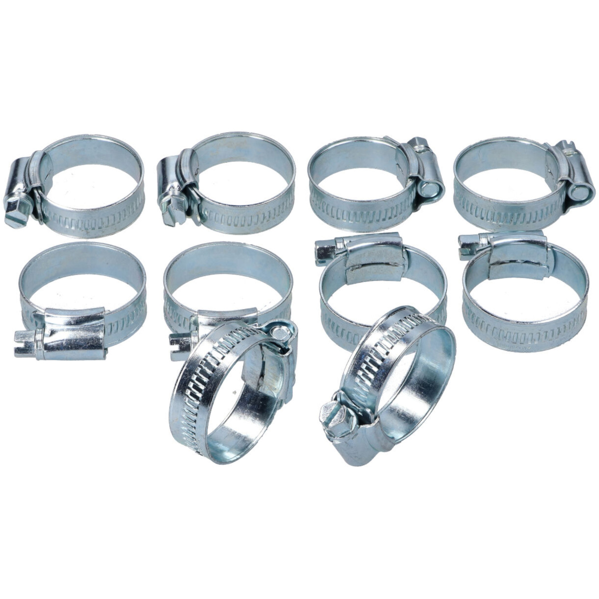 10 pieces hose clamps for fastening hose connections. This hose clamp type is very often used in vehicle manufacturing. The clamps correspond to original equipment quality.
