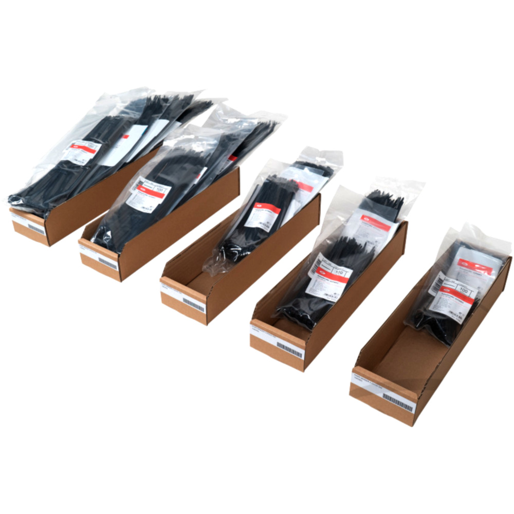 Inhalt:4x Packung a 100 Stück Kabelbinder 4,8 x 368 mm3x Packung a 100 Stück Kabelbinder 4,8 x 300 mm2x Packung a 100 Stück Kabelbinder 3,6 x 200 mm2x Packung a 100 Stück Kabelbinder 4,8 x 200 mm2x Packung a 100 Stück Kabelbinder 2,5 x 100 mm5x Regalkasten StandardWitterungsbeständigHitzebeständigMaterial: KunststoffFarbe: Schwarz