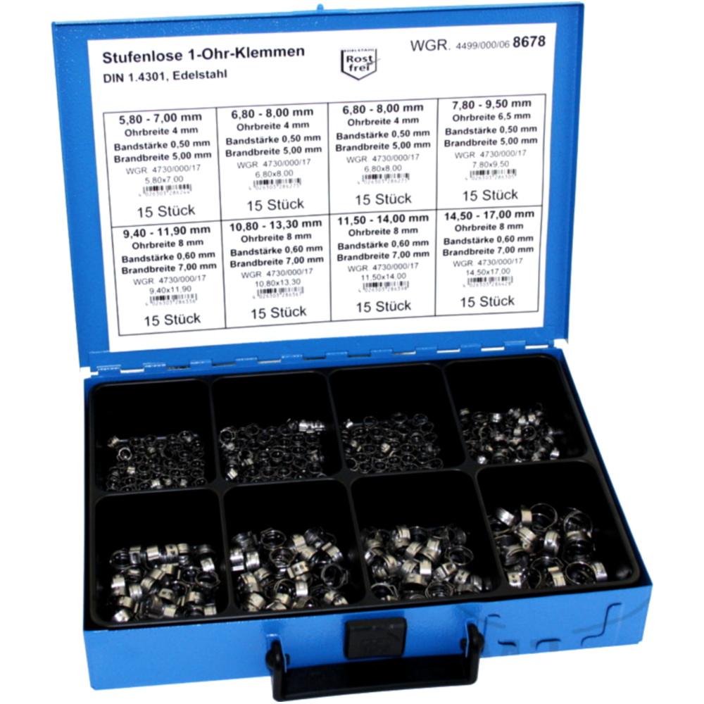 Discover the Oetiker stepless 1-ear clamps made from high-quality stainless steel (DIN 1.4301), neatly arranged in a convenient metal box. This assortment includes 120 stainless steel clamps in 8 different sizes, providing versatility for various applications.